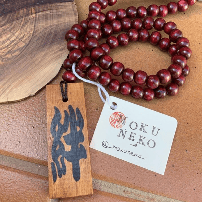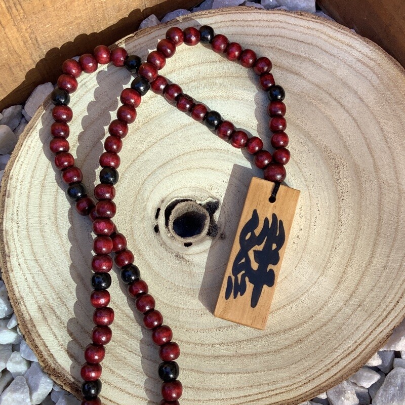 Materiales: madera de pino natural, tinta japonesa, barniz, cordón de algodón y nailon, cuentas de madera o piedra natural ojo de tigre.