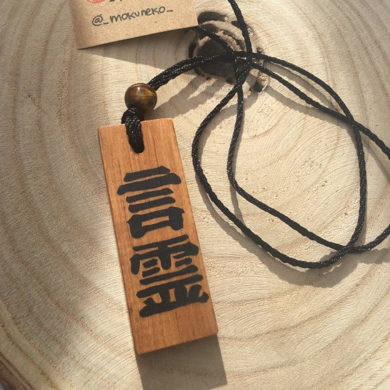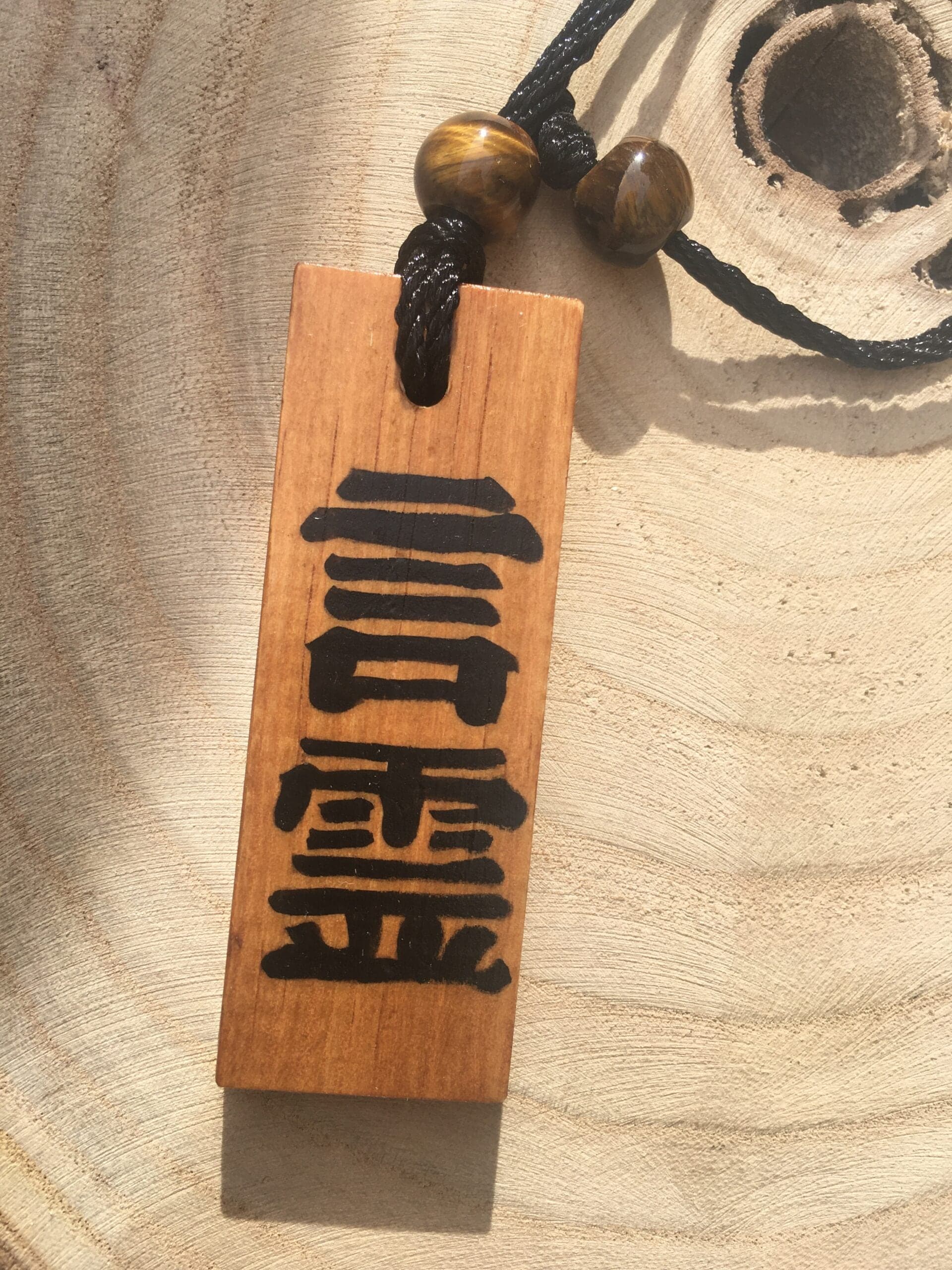 Colgante kifuda con el mensaje KOTODAMA ‘En el antiguo Japón se creía que las palabras tenían un poder misterioso’.