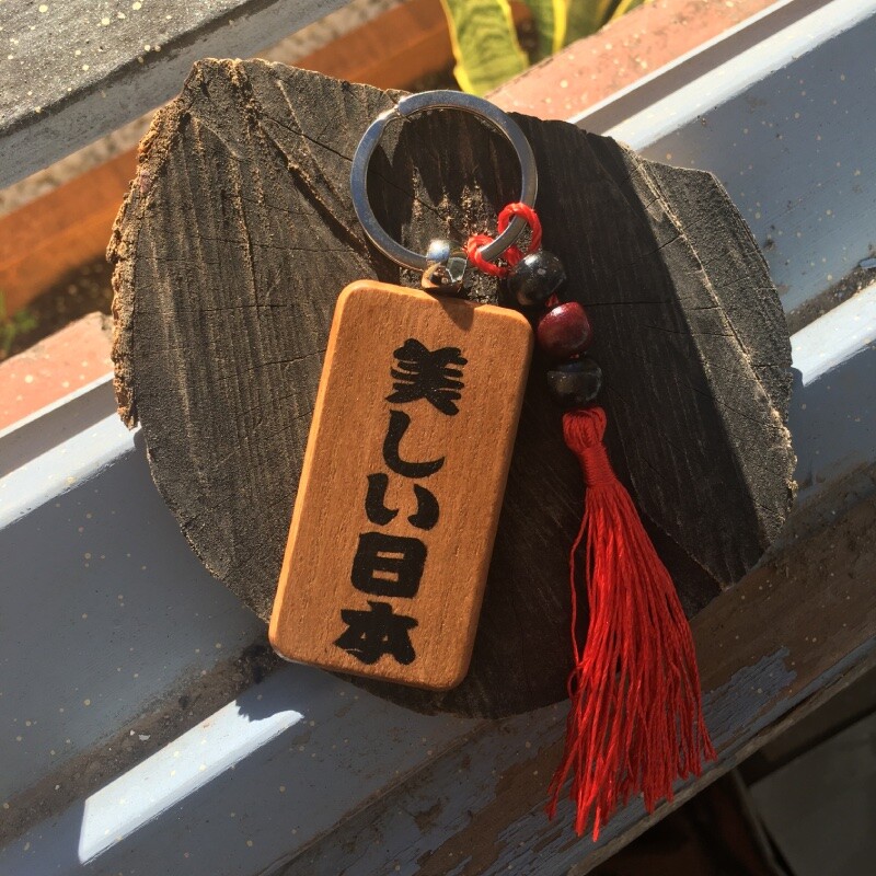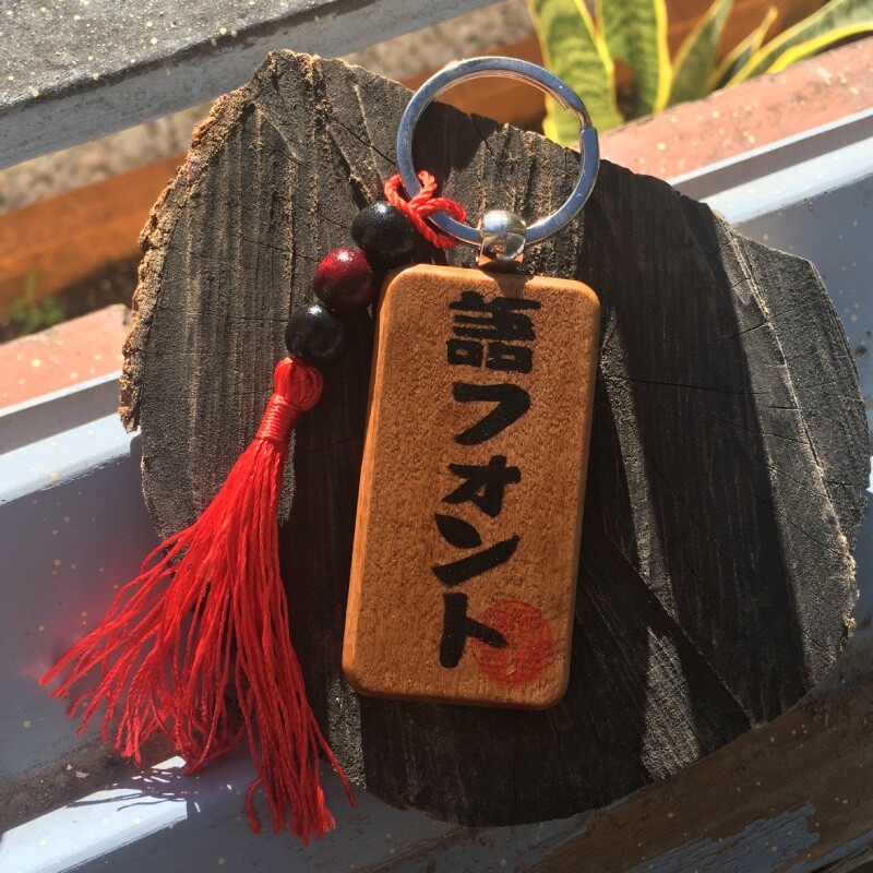 Materiales: madera de pino natural, barniz colorante, tinta japonesa, barniz protector, anilla o cadena y mosquetón de metal. Adorno con cordón de nylon y cuentas de madera teñida o piedra natural.
