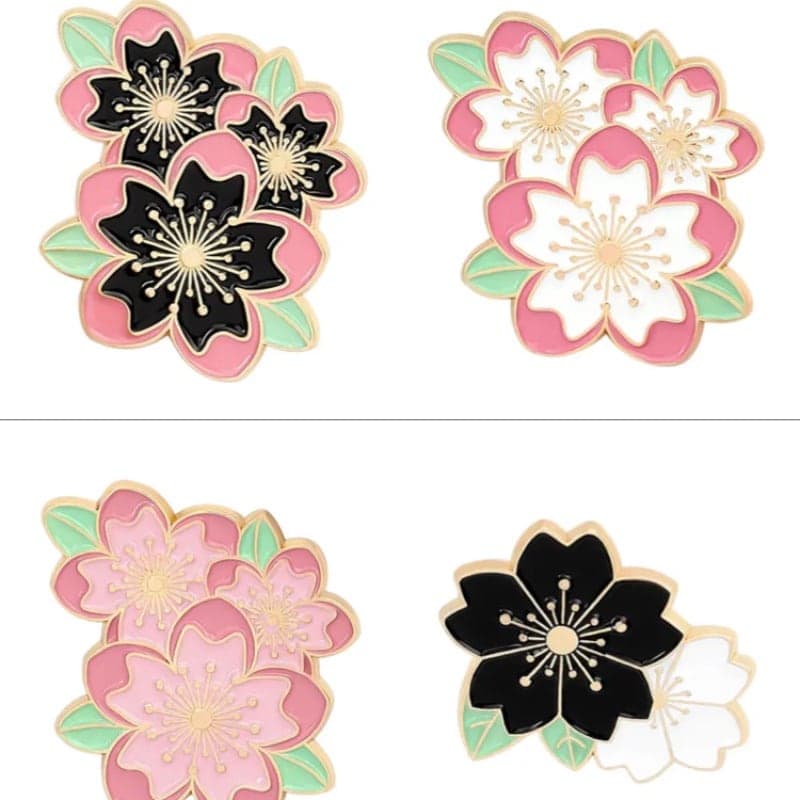 Pin 2 Sakuras negra y blanca, Pin 2 Sakuras rosa y blanca, Pin 3 Sakuras blanco, Pin 3 Sakuras negro, Pin 3 Sakuras rosa, Pin Botan lila
